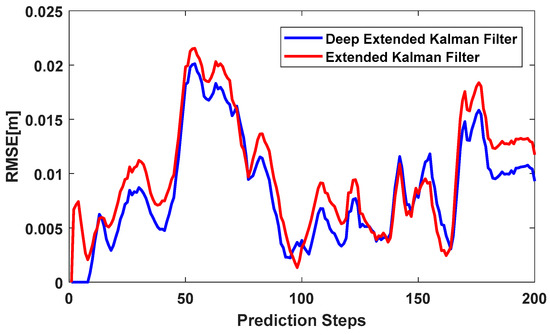 Figure 6 shows that the performance of RNN depends on the sequence length of previous state vectors. If the sequence length is large, the network uses more IMU errors in the previous time. In other words, the network applies more heuristics to predict IMU errors and remove them from IMU positioning. Therefore, the RMSE of the deep extended Kalman filter was less than the RMSE of the extended Kalman filter, at earlier times.