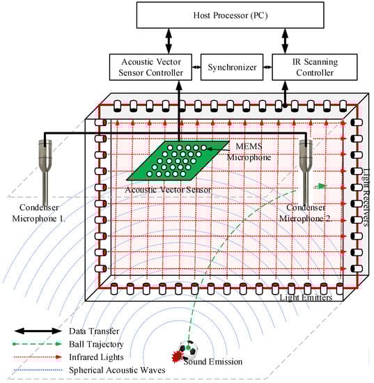 Figure 1 shows an overview of the proposed system to estimate 3D ball motion. Prior to the estimation process, the acoustic sensors should be calibrated, and the two controllers (i.e., acoustic vector sensor and IR scanning controllers) should be synchronized. The proposed system is comprised of three steps: sound-based ball firing detection, sound source localization, and IR scanning for motion analysis. Figure 2 shows the proposed estimation architecture for 3D ball motion. When a ball is fired, the acoustic vector sensor receives impulsive sound signals, which is emitted whenever the ball is hit or kicked. The ball hit is detected when a predefined threshold is reached. The acoustic vector sensor controller recognizes whether the received sound is a ball firing through an MFCC-FFNN algorithm. The IR scanner detects a ball-shaped object and determines its position on the virtual plane (i.e., the red plane in Figure 1) when it passes through the designed IR scanning frame. Both controllers transfer their data containing acoustic and IR light signals to the host processor (i.e., a PC in the proposed system). Subsequently, the host processor estimates the initial ball position using impulsive sound source localization method and the ball speed and angle of projection from the output results of both the sound source localization and the IR scanner.