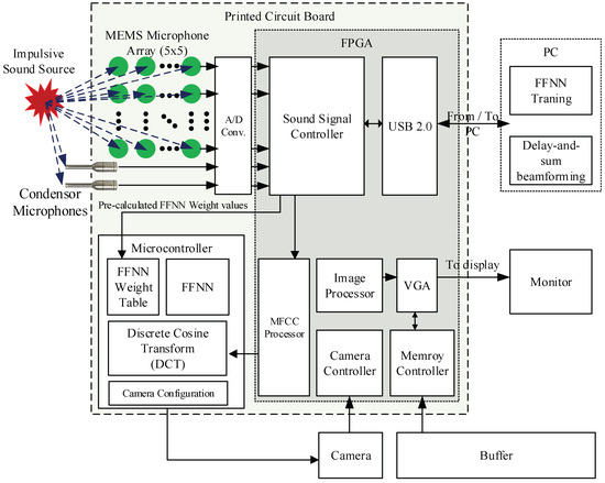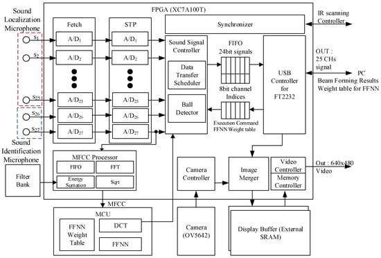 Figure 7b shows the implemented acoustic sensor controller, which receives acoustic signals from 27 microphones and synchronizes their phases. It recognizes the sounds produced by the ball and filters other types of sounds from a single motion-blurred image [28] and transfers the sound information to the host processor via a USB connection. The controller is mostly implemented on the cost-effective Artix-7 XC7A100T FPGA (Xilinx, Inc., San Jose, CA, USA) and STM32F microcontroller (STMicroelectronics, Geneva, Switzerland) to support the final stages of MFCC, the FFNN algorithm, and communications, as shown in Figure 3.