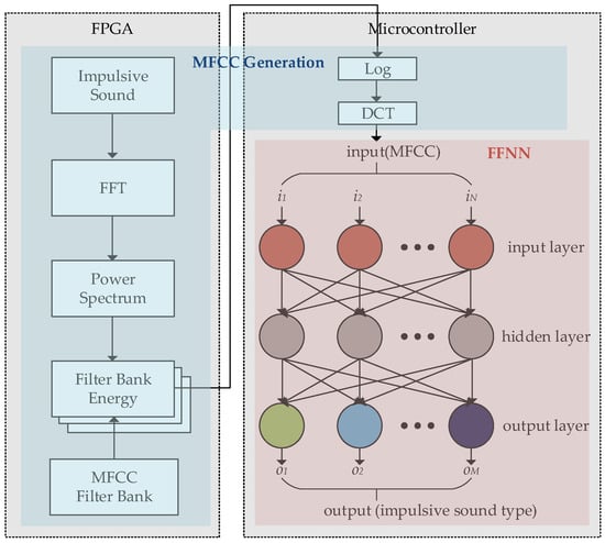Figure 3 shows a diagram of the MFCC-FFNN algorithm for the proposed system, where the MFCCs represent the input feature vector of the FFNN. Inspired by the neural network approach [21], our system detects and identifies whether an impulsive sound corresponds to ball firing from a learning-based model. Given that the FFNN training would take a long time on the embedded microcontroller, we executed this training on the host processor and transferred the weights and training outputs to the embedded system. After analyzing the MFCC and FFNN, we found that the MFCC estimation takes much longer than the FFNN execution given the large amount of iterations to obtain the Fourier transform and to sum the filter bank energy. Considering the MFCC and FFNN processes, we implemented most of the MFCC estimation using a field-programmable gate array (FPGA) to improve computational efficiency. Only the logarithmic and discrete cosine transform stages of the MFCC estimation are conducted at the microcontroller to provide the FFNN inputs. The parameters of the implemented MFCC-FFNN algorithm are listed in Table 1.