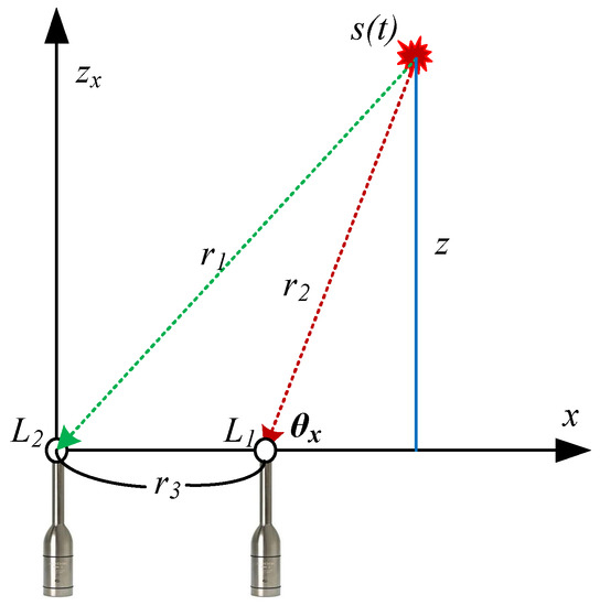Figure 5 shows the estimation of the z-axis value (i.e., the distance between the measurement and the prediction planes depicted in Figure 4). Variables L1 and L2 represent the sound pressure levels of the two microphones for depth estimation, r3 is the distance between the microphones, θx is the sound source direction obtained in Section 4.1, and r1 and r2 are the distances between the sound source and microphones corresponding to L1 and L2, respectively. The relation among r1, r2, and r3 is defined according to the law of cosines as