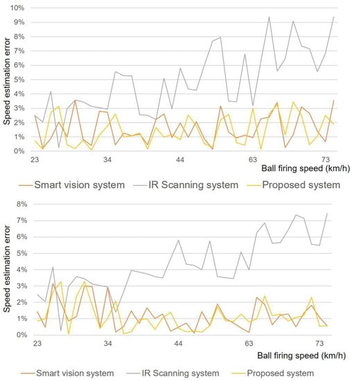 Speed error comparisons of baseball (top) and soccer ball (bottom) between smart vision system, standalone IR scanning system, and proposed system using Stalker Pro II sports radar gun as reference.