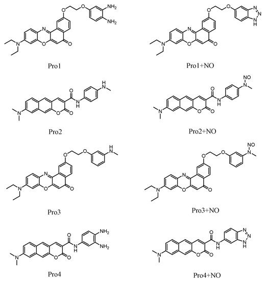 As is well-known, a large Stokes shift can efficiently avoid the interference between the absorption and emission spectra, which is useful to improve the sensitivity and accuracy of the detection. In this study, the Stokes shift of the probes after reacting with NO is calculated. The results are 88 nm, 90 nm, 88 nm, and 90 nm for Pro1 + NO, Pro2 + NO, Pro3 + NO, and Pro4 + NO, respectively. This exhibits that molecules with coumarin derivate as the fluorophore have a larger Stokes shift, revealing the superiority of this fluorophore.