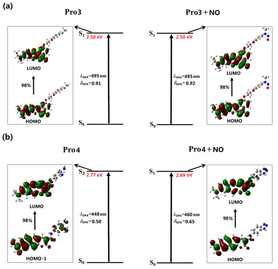 Careful inspects on the transition natures of Pro1 and Pro2 with the absence and presence of NO show that the maximum OPA states of both Pro1 and Pro2 are the second excited states, whereas those of Pro1 + NO and Pro2 + NO are the first excited states. In particular, the maximum OPA states of Pro1 and Pro2 are originated from the HOMO – 1 to LUMO transition (HOMO represents the highest occupied molecular orbital and LUMO represents the lowest unoccupied molecular orbital), and those of Pro1 + NO and Pro2 + NO are resulted from the HOMO to LUMO transition. Given that molecular orbitals involved in the absorption processes of the molecules are mainly localized on the fluorophore moiety, the absorption of Pro1 and Pro2 are mainly distributed there both in the absence and presence of NO.
