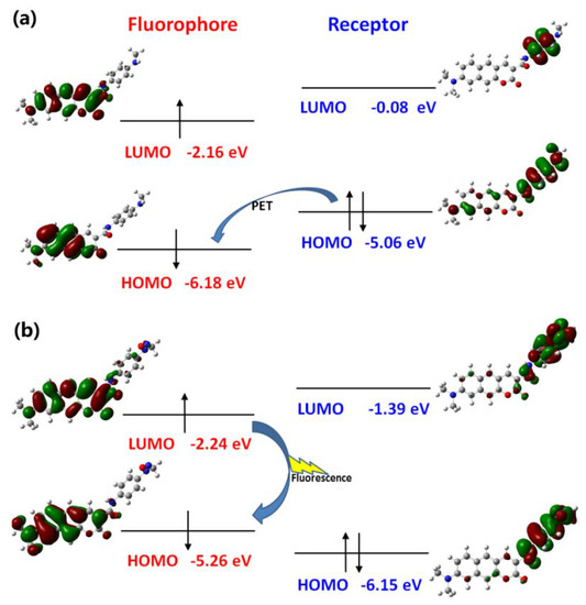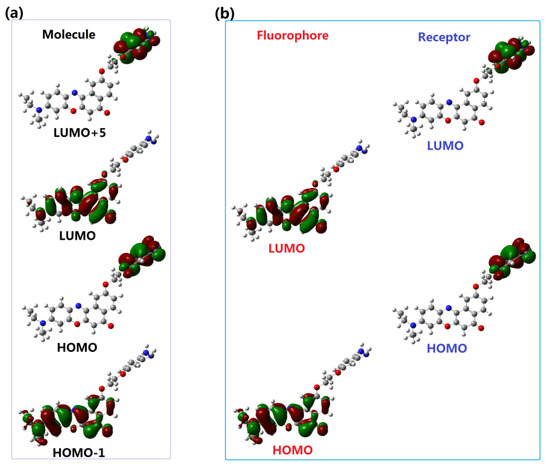 As reported in the experiments [32,33], the recognition of NO for Pro1 and Pro2 pertains to the PET mechanism, However, theoretical elucidations on the mechanism for both the experimental and our designed probes have not been carried out to date. On the basis of the OPA and OPE properties of the molecules, we intend to further investigate the recognition mechanisms of the probes by using the molecular orbital distribution diagrams. Some frontier molecular orbitals of Pro1 are given in Figure 6a. One can see that a part of orbitals, such as HOMO − 1and LUMO, are mainly constrained on the fluorophore moiety, while others, including HOMO and LUMO + 5, are on the receptor part. Hereby, these molecular orbitals can be divided to the fluorophore’s orbitals and the receptor’s orbitals, respectively [43], as shown in Figure 6b. That is, the HOMO − 1 (and HOMO) and LUMO (LUMO + 5) of the whole molecule are, respectively, the HOMO and LUMO of the fluorophore (and receptor). The energies of the corresponding orbitals are labeled in Figure 7. It is clear that the energy of the receptor’s HOMO is −5.07 eV, and it is higher than the energy of the fluorophore’s HOMO of −5.29 eV. As a consequence, when excited by the light, the electron in the HOMO of the fluorophore is promoted to the LUMO of the fluorophore, following by the electron transfer from the HOMO of the receptor to that of the fluorophore, which causes fluorescence quenching of the fluorophore.