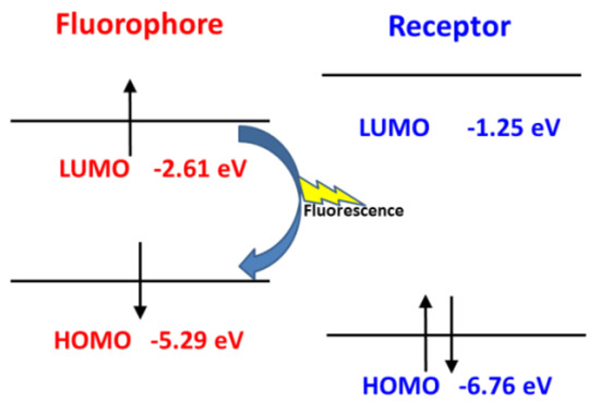 However, after reacting with NO, the frontier molecular orbitals and the separation of the orbitals for the fluorophore and receptor of Pro1 + NO are shown in Figure S3. In Figure 8, one can see that, for Pro1 + NO, the energy of the HOMO for the receptor (−6.76 eV) is lower than the energy of the HOMO for the fluorophore (−5.29 eV). Thus, the electron only can transfer between the HOMO and the LUMO of the fluorophore, which inhibits the PET process and a significant fluorescence enhancement is achieved.