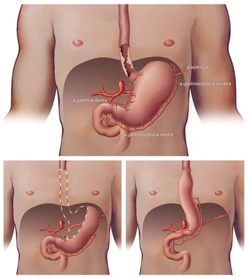 - Miyazaki, T.; Kuwano, H.; Kato, H.; Yoshikawa, M.; Ojima, H.; Tsukada, K. Predictive value of blood flow in the gastric tube in anastomotic insufficiency after thoracic esophagectomy. World J. Surg. 2002, 26, 1319–1323. [Google Scholar] [CrossRef] [PubMed]