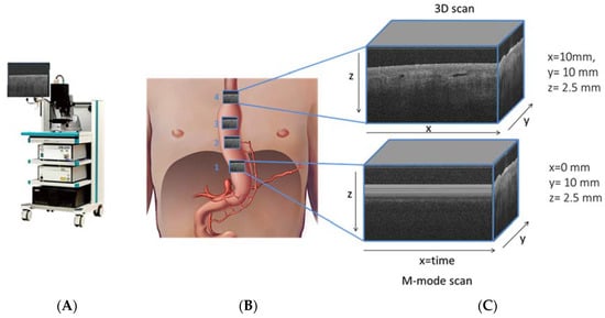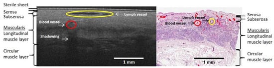 Lymph vessels were visible as well in the OCT images, assuming that the lymph fluid is a low-scattering medium []. Detection and segmentation of the lymphatic vessel, which is outside our scope in the presented work, could potentially add to the analysis of the reconstructed gastric tube OCT data. The clinical value of visualization of lymphatic vessels in the reconstructed gastric tube has yet to be studied.