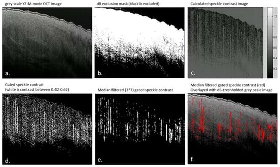 All data analysis was performed using custom-made scripts written in MATLAB (Mathworks, Natick, MA, USA). Using the M-mode scans, the speckle contrast (C) as a function of time was quantified in order to differentiate regions of flow from regions of static tissue. To this end, the following processing steps were applied to the data (Figure 3). First, a dB mask (−2 dB) was applied to exclude noise from the OCT data, where after a region of interest (ROI) in the Y-Z image is chosen to exclude corrupted parts of the scan, if needed. Second, the pixel-specific speckle contrast is calculated along the time axis for all pixels selected. The speckle contrast is the ratio of the amplitude variance over the mean amplitude []. The amplitude of regions with flow on OCT M-mode scans are expected to be Rayleigh distributed and hence have a speckle contrast value of 0.52 []. Here, we have used a speckle contrast gate between 0.42 and 0.62 to detect areas with flow. Next, a median filter with a kernel of 7 by 3 pixels is applied to the speckle contrast images. The pixels remaining after filtering are labeled as flow. The boundaries of the speckle contrast gate and the size of the median filter kernel are optimized by comparing the resulting speckle contrast images with the original X-Z M-mode scans by eye in five randomly chosen scans. Finally, an overlay is created using a Y-Z plot of the gated and filtered speckle contrast and the Y-Z grayscale OCT image. The percentage of pixels labelled as flow relative to the total number of pixels is calculated as an objective parameter to indicate the amount of vessels in the analyzed area.