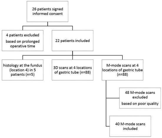 In total, 26 patients signed informed consent. Four patients were excluded based on delay in operation time (measurements interrupted the operation by ±20 min), which made imaging impossible considering patient safety. Therefore 22 patients were included for data acquisition (Figure 4). In all 22 patients, 3D OCT images were acquired at four locations of the gastric tube, from the base to the fundus, the future anastomotic site (n = 88). Furthermore, M-mode scans were acquired at the same four locations of the gastric tube, from physiologically expected normal to decreased perfusion (n = 88). Speckle contrast analysis was not possible for all acquired M-mode scans due to poor quality of the scans (e.g., specular reflections, out of focus, and crossing zero-delay). In most cases the quality of the scans was hampered by specular reflections from the sterile sheet on top of the tissue. In total 48 M-mode scans were excluded. In four patients (n = 12) OCT data acquisition and speckle contrast analysis yielding areas indicative of flow (%) was successful at all four locations.