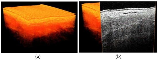 3D OCT scan of the gastric tube, (a) volumetric representation (b) with cross section visualized.