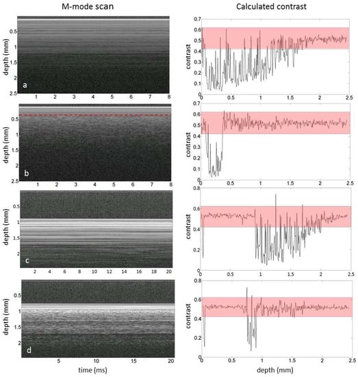 Single M-mode OCT scans (left) and the corresponding calculated contrast (right) of a. a static region of the flow phantom, b. a region with flow in the flow phantom in which the red line depicts the approximated location of the top of the flow channel, c. a static region of tissue and d. a region with flow in tissue by a blood vessel at approximately 0.2 mm below the tissue surface. The red bar depicts the speckle contrast threshold used in this manuscript.
