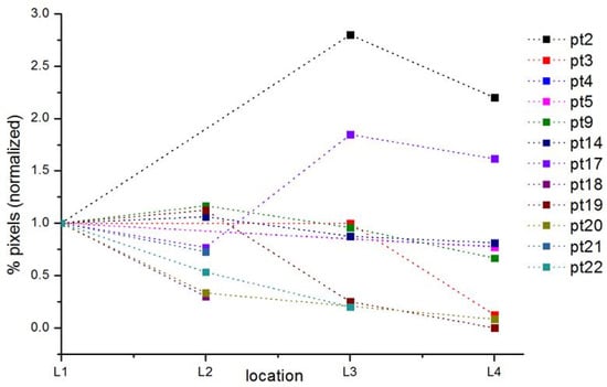 Normalized percentage of pixels per patient per location obtained from the OCT M-mode scans. The values are normalized relative to location 1, hence only the plots for patients with a value for location 1 are shown.