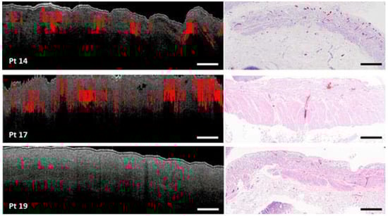 Although the OCT scan and the histology slide are not one to one correlated, the amount and location of the blood vessels tend to agree per patient. Histology of patient 14 demonstrates many blood vessels localized in the superficial subserosa, which is evidently visible in the OCT scan. Histology of patient 19, in contrary, shows no blood vessels, except for capillaries, which is demonstrated in the OCT scan as well.