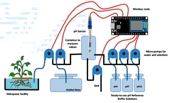 In order to obtain accurate measurements, the sensor needs to be periodically calibrated. To this end, three ready-to-use pH reference buffer solutions to perform decalibration and provide distilled water to clean the probe are required. Firstly, we need to clean the glass bulb of the electrode. Next, the pH sensor has to be turned to calibration mode. After injecting the calibration solution into a beaker, the electrode is immersed on it with a micro-pump. Figure 1 shows our auto-calibrated pH sensor with the micro-pumps that provide the measured values of required liquids to the container, to perform firstly, the calibration process and secondly, the measurement of the pH value of the nutrient solution in our hydroponic duct.