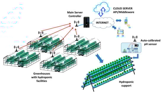 Over the last decades, traditional horticulture and greenhouse-growing have experienced an important evolution due to the advent of more environmentally friendly alternatives. Dry season periods and climate change generate a low storage nutrient solution quantity [1]. For this reason, it necessary to implement new strategies to treated wastewater to allow its reuse in irrigation. Thus, integrated horticulture requires lower water quality and irrigation systems involving advanced technology that is applied according to a bio-dynamic schedule based on water quality [2]. The latest revolutions in greenhouse-growing have been due to advances in technology and wireless communication [3]. Such technology is used in precision farming whereby large amounts of data can be analysed following collection by a Wireless Sensor Network (WSN). Measurements show significant spatial variability in temperature (Ta) and humidity allowing the production of high volumes of a crop with the levels of quality required by the market. Precision farming helps farmers to monitor [4] and control the micro-climatic conditions in the greenhouse [5] and the diseases and pests that affect the plants. There are different environmental factors and micro-indoor climatic events that can affect the state of the plants. Temperature and relative humidity (RH) influence the development of plants (i.e., their growth and quick maturation) and the proliferation of some diseases. Drip irrigation can negatively impact the development of diseases derived from salinity, pH and fertilizer levels. An auto-compensated framework is focused on the prevention of false alkalinity data acquisition and blind drippers—a disease caused by irrigation and fertilizer optimization. It is one of the most damaging greenhouse production diseases in terms of greenhouse efficiency. When environmental and micro-indoor climatic conditions are favorable, it is easier to control the irrigation of water quality. It is important to note that when growing greenhouse crops, the point in the life cycle of the production at which particular nutrient solutions should be applied should be known and, it is critical to apply the right fertilizer treatments or drip system cleaner at the right time and at the right place. Despite the horticulture industry’s reputation of being environmentally safe, prior research has shown that cultivation and production of vegetables in greenhouses are associated with a large number of environmental issues [6], in some cases due to chemical treatments. Some of the main factors involved include water waste and its quality, the production and management of organic and inorganic solid waste, energy used to feed the entire system, the generation of Greenhouse Gas (GHG) emissions [7], the use and management of chemicals in the greenhouses, land use issues, and the impact on ecosystems.