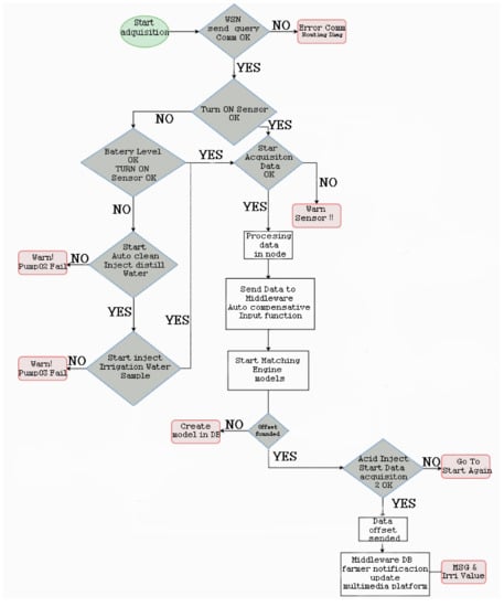 As Algorithm 1 shows, the system firstly checks the wireless connectivity and nodes’ status. In this phase, the system determines if there are any problems related to the battery level or any other hardware issues. If the values from the sensors are out of range, the system starts the auto-clean process and the calibration tasks. The next step is data gathering, and if these values are inside the normal range, the data is wirelessly sent to the middleware located in the server. When the middleware receives new data, it starts to compare the new values with the historic data and values of equivalent dosages preconfigured in the algorithm. After processing the data, the value of acid to be added to the nutrient solution is calculated. At this point, the acid micro-pumps are enabled to inject the amount of acid required. Finally, the system rechecks the pH level to verify that neutralization process has been successfully performed.