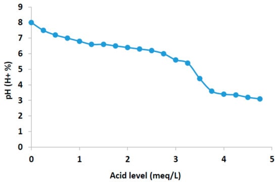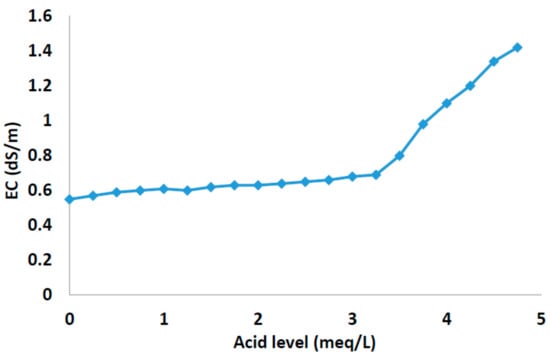 Figure 5 shows the EC of water as a function of the of added acid. As we can see, the EC increases by 2–3% when a new acid is added (from 2.8 ). Many commercial EC meters automatically normalize the readings at 25 °C. Our algorithm determines the inflection point as a result of two stretch intersections of bicarbonates. Soluble salts are detected by measuring the EC of the nutrient solution since it is the dissolved ions that conduct the electrical current through the water. Pure, distilled water does not conduct electricity. EC is usually reported as a unit of electrical resistance, the scientific standard for measuring EC. The metric is equivalent to the mho (. The level of soluble salts that is acceptable in a nutrient solution varies from near zero for hydroponic systems to up to about 1 mS/cm for potted crops. A higher conductivity means a greater quantity of salts in the water which can lead to plant injury under certain conditions. Through this graph, we can see that the relationship between the amount of acid injected and the EC value based on the real scenario tested determines the quantity of acid that has to be injected to neutralize bicarbonates. It is shown as the second stretch increase.