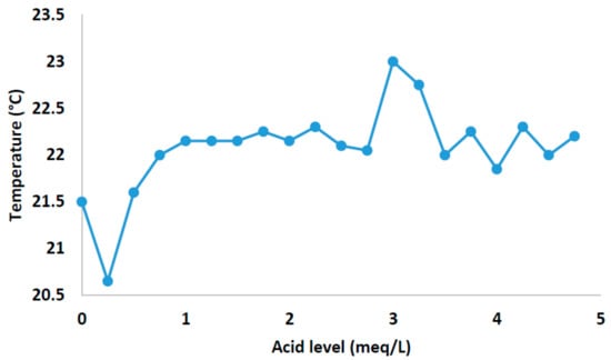 Figure 6 shows the relationship between the temperature and the of added acid. As we can see, in the first stretch of the graph, there a negative slope; this is due to the ionic equivalent present in the water. When the process of auto-compensation is carried out and the acid is injected (from 2.8 ), the bicarbonate ion is neutralized and the second part of the graph fluctuates more than the first part.