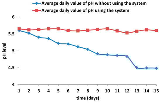 Finally, we test two possible cases, i.e., the evolution of the pH level when the auto-calibrated pH sensors and our algorithm are not used and when the designed system is used (see Figure 7). The experiment was carried out over two weeks, in which a measure was taken every 6 hours to calculate the average daily pH value. This comparison intends to show the differences between a system that uses an unmanned auto-calibration system and when sensors without assistance are used. When we do not carry out rectifications of the nutrient solution, the pH value of the water contained in the gutters loses the desirable value for the crops as time goes on, and to weather conditions such as rain or water evaporation due to excess heat. However, when using our system, the acidity level of the irrigation water is modified according to the water of the gutters, to maintain the overall desirable pH level of the water offered to the crops. As we can see, when the system is used, the pH value is stable at values between 5.5 and 5.6, while in a scenario where our system is not used, the value of pH decreases as a function of the time reaching values too low for crops. A pH lower than 5.5 is a potential problem, and the elemental constituents of the water should be examined. Some factors than can generate these changes are the rain or water evaporation in gutters due excess of heat.