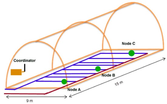 In order to determine the network’s performance, we have deployed the network shown in Figure 8. Node A was placed 7.50 m away from coordinator, located in the main wall of the greenhouse. It was installed at a height of 60 cm and the distance to the edge of the dense tomato foliage was 40 cm. Node B had a distance of 11.8 m to the coordinator node, and it was placed at the height of 60 cm. The length between the first plants and the device was 74 cm. Node C was at the end of greenhouse (at 14.5 m from main wall). The distance from the node to the edge of the foliage was 35 cm. Periodical sleep and wake modes were applied to reduce energy consumption. Each node woke up and turned on its radio for 15 s and went then back to sleep and turned off its radio for 255 s (4 min 15 s). For each slot time, only one of the three nodes equipped with sensors read data from the sensors and waited for the data request from the coordinator. The coordinator was in charge of taking care of the data received; the rest of the nodes were only able to reply to the coordinator’s requests. Thus, the coordinator acted as the master device which polled data from the sensor nodes at certain time periods.