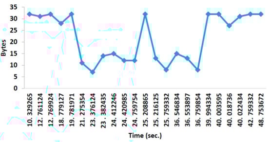 Figure 9 shows the consumption in bytes of the network for the message exchange explained. According to the recommendations of the manufacturers, if we keep the automatic confirmation active, we are limited to only five nodes in the network. Therefore, for this work, it is necessary to deactivate this function and to expand a multi-network with more than six nodes. This function was implemented by software. Our implementation allowed the use of up to 255 addresses. The frame format consists of the origin address (first byte), the destination address (second byte), forward address (third byte), acknowledgement (forth byte) and data (from fifth to 32nd byte). So, our frame has a length of 32 bytes.