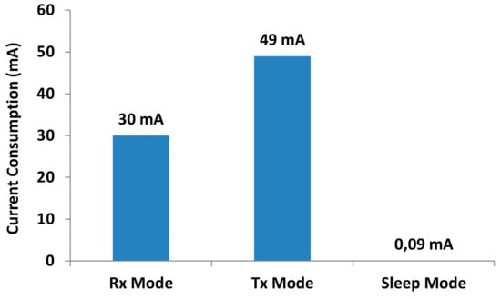 Finally, Figure 10 shows the current consumption values of these radio communications modules when they are operating at 3.3 V. When the node is transmitting, the current value is around 30 mA. The current consumption of the node when transmitting data increases up to 49 mA. Finally, when the node is in sleep mode, the current consumption is radically reduced to 90 μA.