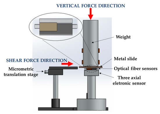 For the calibration of the FBGs cell to FS, a metal slide placed between the sensing units and a metal cylinder bar (3 kg) was horizontally dragged with the help of a translation stage [8], as shown in Figure 2. The translation stage pushed the metal slide parallel to the sensors’ top area, inducing an FS in both sensing units (electronic and optical). During this test, the FV was maintained constant (∆FV ≈ 0 N). For the calibration to FV, a variable force was applied on the cylindrical bar, while the FS was kept constant (∆FS ≈ 0 N). During these procedures (FS and FV calibration), the values registered by both sensing systems were simultaneously acquired for further comparison/calibration.
