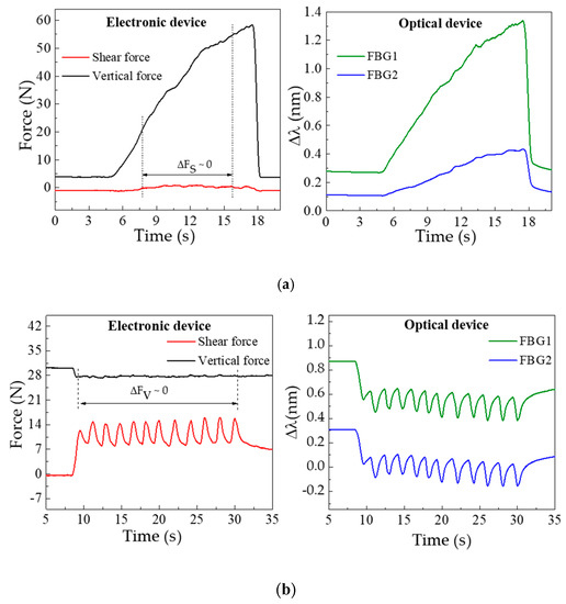 Figure 3 shows the data simultaneously acquired by the electronic and optical systems, for the FV (a) and FS (b) characterization procedures. The FV characterization, Figure 3a, clearly shows the increase of the registered pressure with the load applied over time. In the case of the optical sensor, this increase is translated by a continuous wavelength shift towards higher wavelengths in both FBGs. Such a shift is caused by the longitudinal distension (stretching) of the resin under vertical compression, which will induce the elongation of the embedded optical fiber and consequently the positive Bragg wavelength shift. In the representation of the shear calibration data (see Figure 3b), the periodic variations induced by the translation stage movements are visible in both sensors.