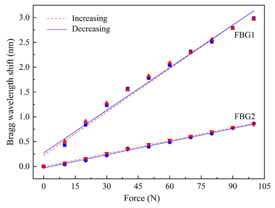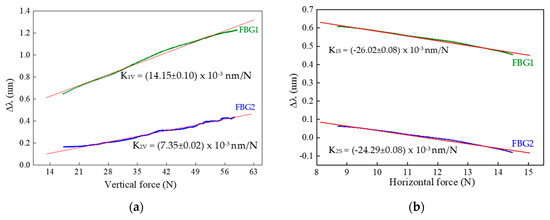 After the calibration, and using the same experimental setup as depicted in Figure 2, the sensor was tested for simultaneous FS and FV loadings. The Bragg wavelength shifts, modulated in the optical fiber sensors under simultaneous shear and vertical loadings, can be related to the applied forces by a two-equation system [8]: