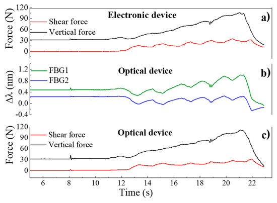 Response to the applied forces as a function of time for the: (a) electronic sensor; (b) FBGs cell, with the response as Bragg wavelength shift; (c) FBGs cell, the forces are calculated by applying Equation (2) to the registered wavelength shifts.
