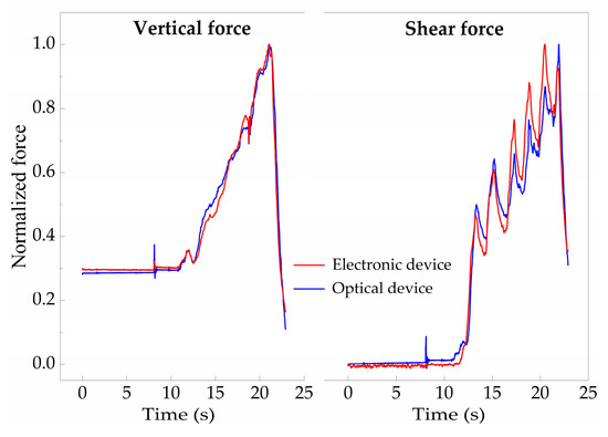 After applying Equation (2) to the Δλ values obtained from the optical sensing unit, it is possible to obtain the correspondent force values, as presented in Figure 6c, which match the values acquired by the electronic sensors. Moreover, when comparing both sensors’ responses, the differences between the curves obtained by the optical and the electronic sensor have a normalized root mean square error value of RMSEV = 0.025 for FV and RMSES = 0.053 for FS, as presented in Figure 7, indicating the reliable performance of the optical sensor and its suitability to monitor FV and FS, simultaneously.