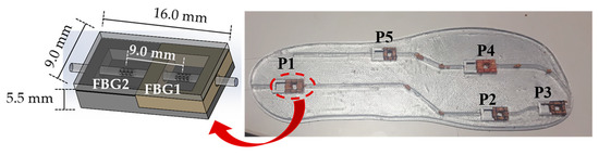 Bearing in mind such key areas and gait pattern features, we have designed and produced an insole incorporating a total of five sensing cells, similar to the one described in Section 3. A single optical fiber, containing a total of 10 FBGs, was incorporated in the insole, as depicted in Figure 8.