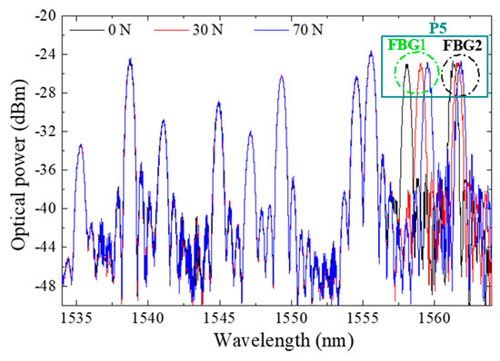 Figure 9 displays the optical spectra obtained for the developed insole during the vertical force calibration of the FBGs cell “P5”. Since the whole system is placed in one optical fiber with 10 multiplexed FBGs, the Bragg wavelength corresponding to each FBG is also visible. However, during the calibration process, only the FBGs corresponding to the sensing cell inserted in P5 responds to the local applied loads. Such a characteristic confirms the good isolation of the designed sensing cell to forces applied in its surroundings, and its suitability for a precise local analysis. Additionally, the presented design (size, number and location of the sensing cells) can be customized according to a doctor prescription and each patient/situation’s specific needs.