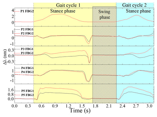 Figure 10 represents the registered Bragg wavelength shift for each FBG, in the 5 points, during a 3 s gait. Due to a malfunction in the interrogation system, the Bragg wavelength acquired for FBG1 in P1 had extensive value gaps along time (Bragg wavelength returned as zero) and therefore its values were ignored.