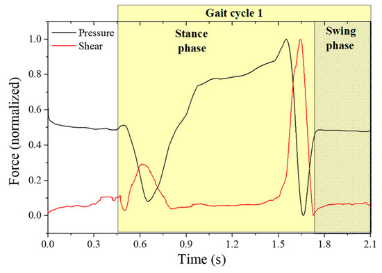 Moreover, the instant in which the shear is a dominant force in the gait cycle is clearly visible (end of the stance phase), as well as the areas in which it is more predominant, namely, the metatarsal (P2 and P4) and the toe (P3) areas.
