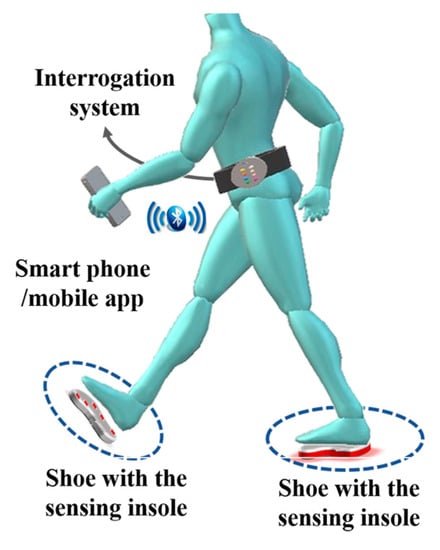It has been emphasized throughout this paper the importance of the compact size of the sensing architecture, in addition to its resilience. These two properties render the architecture suitable for integration within a non-invasive e-Health system for the continuous monitoring of patients and elderly citizens. The proposed insole design, described in Section 4, would comprise one part of the whole mobile e-Health solution, used to continuously monitor patients for irregularities in their gait movement. The envisioned overall non-invasive monitoring solution is shown in Figure 12. The system comprises three components: the sensing element, the interrogator system, and the mobile app on a smartphone. The first part, which is the optical fiber sensing architecture, has been extensively explained throughout the paper. It is basically represented by the insole integrated with the optical FBGs cells, as explained in previous section.