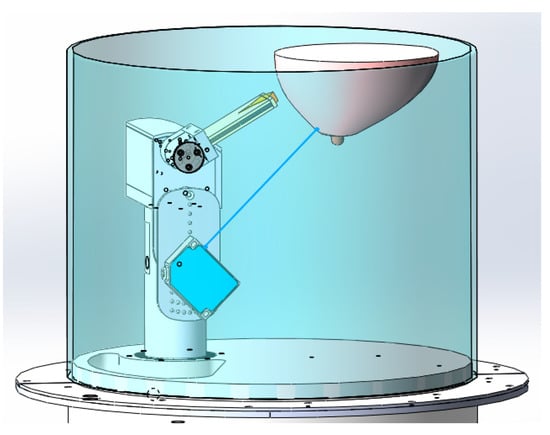 Diagram of the positioning arm in the imaging tank with the antenna and laser attached.