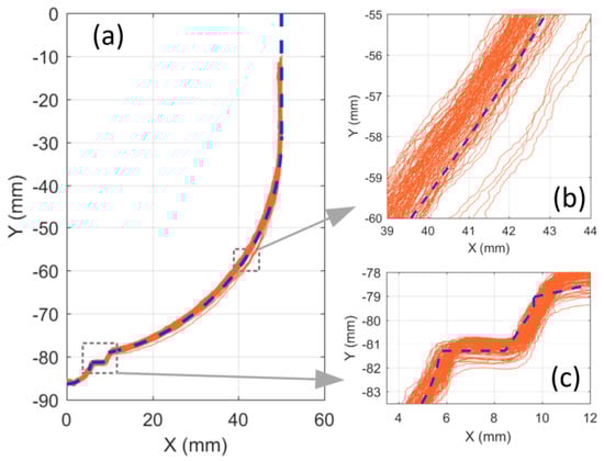 To evaluate the similarity between the recorded profiles, the surface estimation procedure described in D. Kurrant et al. [15] was applied to the measured laser points to reconstruct the three different surfaces. Using Equations (5) and (6) in D. Kurrant et al. [15], the similarity between the three reconstructed surfaces was measured at 0.984, 0.977, and 0.978. These values are comparable to the ideal case when the measured surfaces were compared to the true surfaces [15].