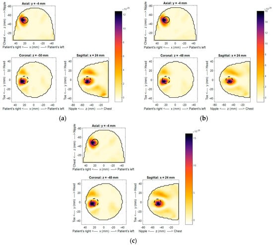 Using the technique described in E.C. Fear et al. [10], images were reconstructed for the three different scans and are shown in Figure 11a–c. Note the image reconstruction, including data loading, takes 37 s on a standard desktop computer. Detection of the tumor was noted in all images, confirming that the target response was within the sensitivity of the system. Only marginal differences were observed among all images, confirming the overall consistency of the system. The target was detected at the expected location. Notably, although best efforts were made to accurately place the target within the phantom, the expected location, noted by the dashed circle in Figure 11, may not be exact. In terms of detected location variation, the change of the centroid location between scans was measured. A maximum of 1.22 mm and minimum of 0.25 mm were measured between scans 1–3 and scans 2–3, respectively. Additionally, the difference in the overall backscatter response measured using the MHD as described in B.R. Lavoie et al. [17] ranged between 0.49 mm and 0.17 mm. The highest and lowest values were between scans 1–3 and 2–3, respectively. This level of consistency confirms the precision of the sensor positioning, laser outline, and microwave reflection measurement as the image reconstruction depends on all of these factors. Artifacts in the images were small and largely related to the echo of tumor response, suggesting effective reduction of the skin reflection, as expected with similar skin responses.
