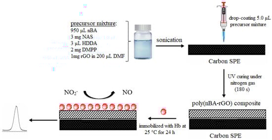 A photocuring mixture of the polymer n-butyl acrylate-co-N-acryloxysuccinimide was prepared by mixing 950 μL nBA monomer, 3.0 μL HDDA crosslinking reagent, 2.0 mg DMPP and 3.0 mg NAS in a scintillation vial. About 1.0 mg of graphene in 200 μL DMF was then added into 125 μL of photocuring mixture solution and sonicated until a homogenous nBA-rGO mixture obtained. A total of 5.0 μL of the mixture was drop-coated onto the SPE and photocured under UV light and nitrogen gas atmosphere for 180 s to form the poly(nBA)-rGO composite film. The electron transfer kinetics on non-modified and modified carbon paste SPEs with rGO and polyacrylic matrix was investigated by CV using 0.1 M Fe(CN)63−/4− as the electrolyte. Hb solution was freshly prepared by dissolving 5 mg of Hb in 500 μL of 0.05 M potassium phosphate buffer at pH 7.0. The carbon paste SPE coated with the poly(nBA)-rGO hybrid film was then immersed in the Hb solution and left to react with the functionalized polymer film at room temperature (25 °C) for 24 h. Finally, the electrode was rinsed with abundant amount of deionized water to remove any unreacted Hb molecules from the electrode surface. The direct electrochemistry of the Hb immobilized on the acryloxysuccinimide functionalized acrylic-graphene composite film modified SPE was investigated by CV in 0.05 M potassium phosphate buffer (pH 7.0), and the potential application of the proposed Hb electrode for the detection of nitrite was explored with both CV and DPV methods. The schematic design of this Hb modified graphene nanosheets based electrode is shown in Figure 1.