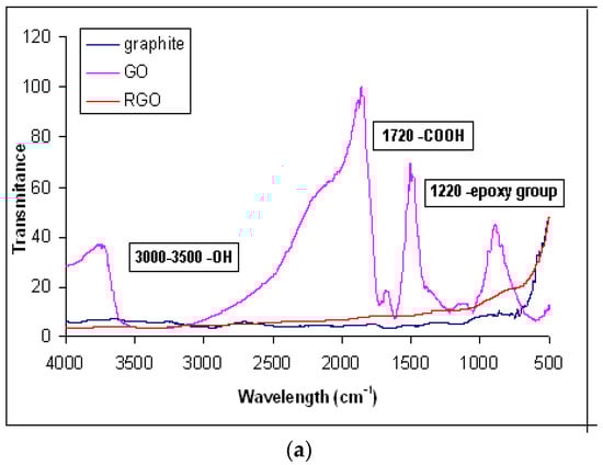 The as-synthesized rGO has been previously applied in the DNA biosensor fabrication and characterized by Raman spectroscopy to study the disorder and defects in both GO and rGO, and the results indicate the removal of oxygen functional groups in GO has created more defect sites in rGO [24]. Figure 2a shows the FTIR spectra of GO and rGO, and compared with that of the control sample by using graphite. A broad absorption band at 3430 cm−1 reveals O-H stretching vibrations, which indicates the hydroxyl functional group of GO. The FTIR absorption peak at 1720 cm−1 shows C=O stretching vibration, which implies the presence of oxygen-containing groups in GO. The epoxy functional group (C–O–C) of GO is indicated by the C–O (epoxy) and C–O (alkoxy) stretching vibration bands at 1220 cm−1 and 1051 cm−1, respectively. These functional groups were then reduced significantly after the reduction process, which suggests the successful reduction of GO to rGO. The as-synthesized rGO has a curvy and wrinkled graphene nanosheets at an average thickness of 2–4 nm, which signifies a complete exfoliation of graphite during ultrasonication treatment (Figure 2b).