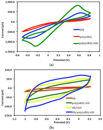 The cyclic voltammogram of Hb-poly(nBA)-rGO-SPE in Figure 3b shows an inconspicuous peak at −0.3 V compared to poly(nBA)-rGO-SPE. This voltammetric peak was found located at the potential characteristic of the heme FeIII/FeII redox couple of the proteins [8]. This denotes the successful immobilization of Hb on the acrylic-graphene hybrid electrode. By comparing the CV of Hb-rGO-SPE with Hb-SPE, the presence of graphene has greatly augmented the electrochemical response of the embedded iron heme of Hb molecules immobilized on the SPE [2,8], and that the direct electron transfer was achieved for Hb immobilized on the rGO modified SPE. The addition of poly(nBA) with succinimide functional groups played an important role in increasing the number of Hb molecules immobilized on the electrode surface via an amide covalent bond, which can be formed between an amine functional group of Hb and a succinimide functional group of the acrylic polymer [17,25]. This was evidenced by the larger CV response of the Hb-poly(nBA)-rGO-SPE compared to Hb-rGO-SPE.
