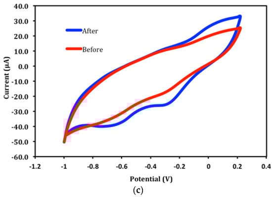 Cyclic voltammograms in Figure 3a show the detailed information about the electron transfer kinetics on non-modified and modified carbon paste SPEs with rGO and polyacrylic matrix in 0.1 M Fe(CN)63−/4− at a scan rate of 0.1 Vs−1. The rGO modified SPE demonstrated a considerable increase in the CV peak height and a decline in the peak-to-peak separation (ΔEp) compared to bare SPE. This suggests that the highly conductive graphene nanosheets have improved the electron transfer rate at the carbon paste SPE surface. Meanwhile, the slow electron transfer rate exhibited by the electrode with polyacrylic film alone indicates that the film is a non-conductive polymer [24]. However, a pair of well-defined redox peaks of Fe(CN)63−/4− couple was obtained when the electrode was coated with the poly(nBA)-rGO composite film.