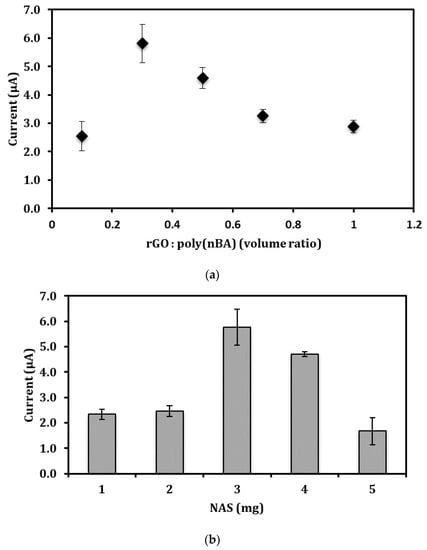 The beneficial properties of n-butyl acrylate (nBA), such as insoluble in water, plasticizer-free, photcurable and low glass transition temperature (Tg), thus provides a sticky characteristic to allow strong adhesion of the resulting acrylic polymer to the electrode surface [26,27,28,29]. In view of the insulating characteristic of the polyacrylate, the graphene-polymer composition must be optimized to allow optimum amplification of the electrochemical signal by the embedded graphene. As can be seen in Figure 4a, the reduction peak current of the nitrite biosensor at −0.6 V increased when the composition ratio between rGO in DMF and acrylic precursor [rGO:poly(nBA)] increased from 0.1 to 0.3 as more conductive pathways were generated by the increasing amount of graphene nanosheets loaded in the acrylic film, thus shortening the electron transfer distance and enhancing the electrical communications between redox centers of heme proteins and the electrode surface. However, the biosensor response progressively diminished as the rGO loading increased from a rGO:poly(nBA) volume ratio of 0.3 to 1.0 due to the overlapping layers of rGO, which has caused the blockage of electron transfer on the SPE surface. Therefore, the rGO:poly(nBA) volume ratio was maintained constant at 0.3 in the following optimization studies.