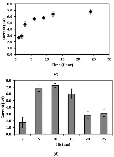 Figure 4c shows the experimental results of the Hb immobilization duration on the acryloxysuccinimide functionalized acrylic-graphene composite film modified SPE. The DPV response of the nitrite biosensor gradually increased at the beginning of the experiment when the Hb immobilization duration was increased from 1–4 h. This was acsribed to the increasing number of Hb molecules covalently attached on the poly(nBA)-rGO-SPE to allow a greater electrocatalytical reduction rate of nitrite to occur at the electrode surface, and that the increment in the electrochemical signal with time can be perceived. The electrochemical biosensor reached a steady state response when the Hb immobilization duration was proceeded from 6–24 h as the available succinimide functional groups on the poly(nBA)-rGO composite film have almost entirely coupled to the Hb molecules. Therefore, no obvious signal change in the electrochemical catalytic response was observed after 6 h of Hb immobilization duration.