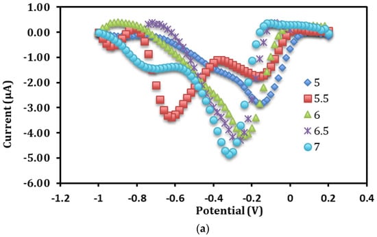 The redox behavior of proteins is often strongly dependent on the pH of the surrounding solution [11,13]. As Figure 5a indicates, the characteristic DPV peak potential of the FeIII/FeII redox couple of Hb was noticed to shift to more negative potentials with the rise in pH from pH 5.0 to pH 7.0, which correspond to the electron transfer reaction accompanied by the exchange of proton [7]. A reduction peak was perceived at about −0.6 V when the reaction medium was adjusted to pH 5.5, indicating that the immobilized Hb catalyzed the direct reduction of 1 mg L−1 nitrite at the electrode surface. The reduction peak at −0.6 V in 0.05 M potassium phosphate buffer electrolyte buffer (pH 5.5) was found to be the most dominant DPV signal for the direct electrochemistry of immobilized Hb on the poly(nBA)-rGO-SPE compared to other pH conditions (Figure 5b), hence pH 5.5 was used to quantify the concentration of nitrite in the subsequent experiments by DPV method.