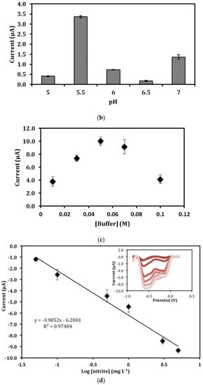 In acidic conditions, i.e., pH 5.5 using 0.05 M potassium phosphate buffer, the Hb-poly(nBA)-rGO-SPE exhibited a cathodic peak potential at −0.6 V in the presence of 1 mg L−1 nitrite (Figure 3c), whilst the generation of nitric oxide (NO) was thermodynamically favorable, and no CV peak was observed when the reaction medium was changed to neutral or basic conditions. This was attributed to the deficiency of proton as the main reason for the failure to generate NO at pH 7 and above. Hence, the CV results confirmed the cathodic peak potential at −0.6 V was ascribed to the reduction of nitrite to NO catalyzed by the immobilized Hb in acidic medium, whilst the characteristic peak potential of Hb heme group remained intact at −0.3 V. Similar electrochemical findings were observed by Liu et al. [7] at diffrerent pHs using a hydrogel supporting matrix for Hb immobilization on the glassy carbon electrode. Since oxygen is a major electroactive compound in natural oxygenated waters and can thus interfere with the developed biosensor in the measurement of nitrite in aqueous-based electrochemical system, and that oxygen can be removed by purging with an inert gas such as nitrogen or argon to avoid interference from oxygen reduction, reaction normally occurs at –0.1 V versus Ag/AgCl electrode.