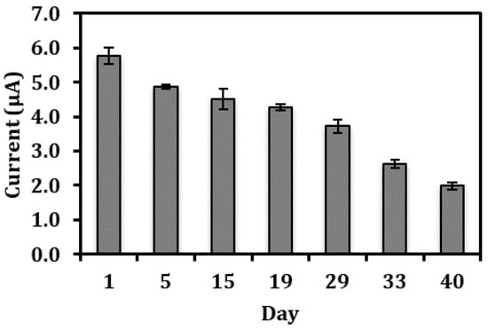 The shelf life profile of the electrochemical nitrite biosensor over a period of 40 days.