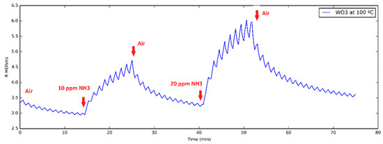 Typical evolution of the resistance of a WO3 nanoneedle sensor operated at 100 °C to two successive 10 and 20 ppm pulses of ammonia. The ripple in the resistance value is generated by a pulsed UV light (30 s ON and 30 s OFF) applied during the whole measurement process.